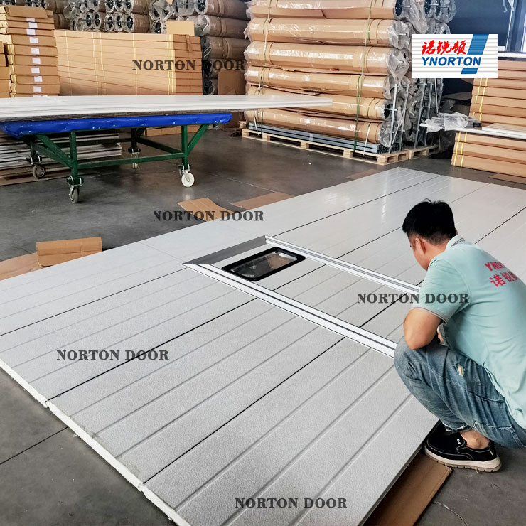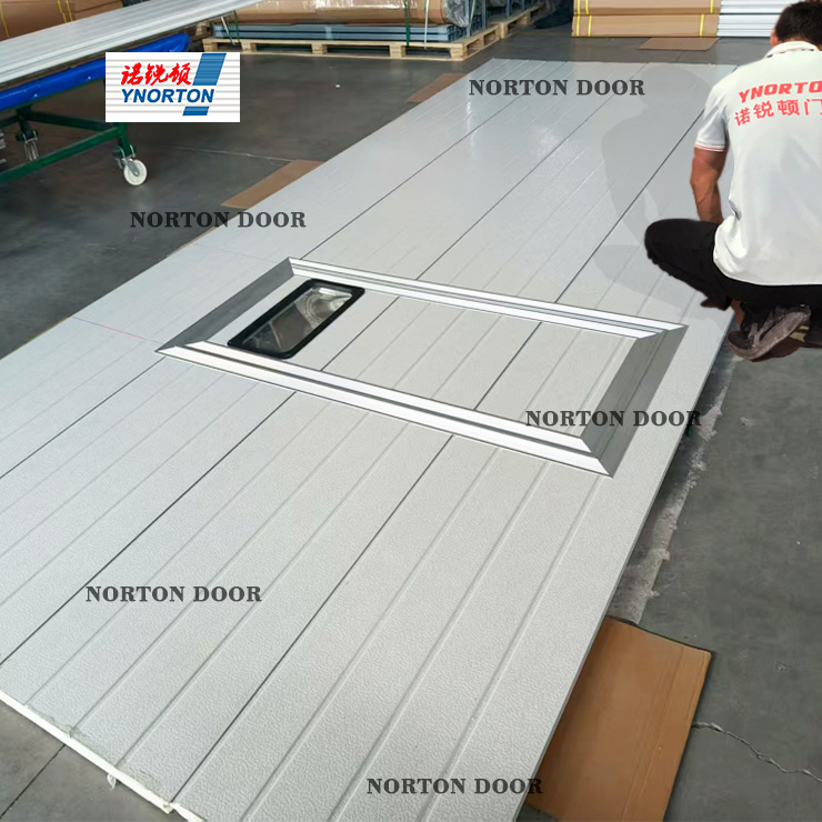 Qingdao Norton Door Technology Co., Ltd.-ek sortutako ate industrialaren atea. Ate panelak zenbait zabalera iristen direnean, integratutako edo kanpoko indartzeko saiheskiak erabiltzen dira atearen lodiera ziurtatzeko eta bat-bateko boladak jasateko 10 haizeak izateko. Egitura arkitektoniko askotara egokituta, ate horiek irekitzeko hainbat mekanismo hartzen dituzte, atearen espazioaren erabilera maximizatuz. Atearen panelen goiko aldean, behean eta aldeek kalitate handiko zigilatze-zerrendak dituzte, panelen arteko zigilatze fidagarria bermatuz. Ateen tamaina eta altuera egokitu daitezke hainbat zama tamaina eta garraio ibilgailuetara egokitzeko. Gainera, ateak aurrez aurre egon daitezke angelu jakin batean egoteko irekita daudenean, lan-fluxu askotariko eta diseinu espazialei arreta emateko.